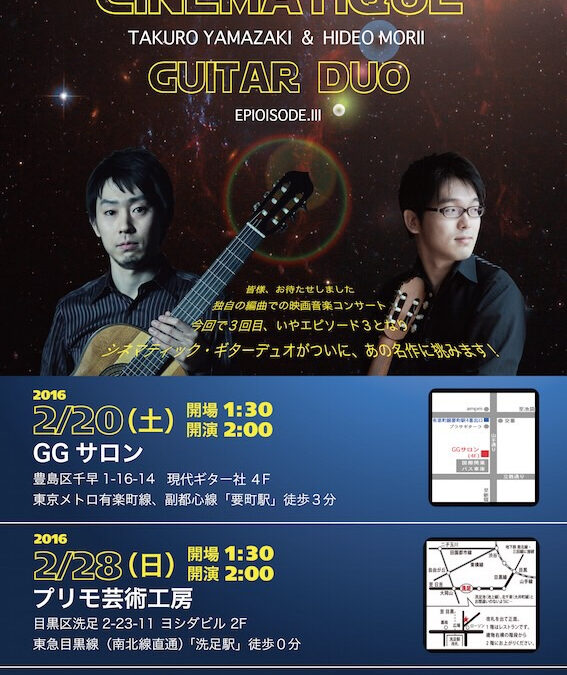 『エピソード3』と題してまたまた、古今東西さまざまな映画の音楽をギターソロとデュオでお届けします。