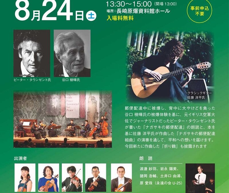 プログラム: 郵便配達中に被爆し背中に大火傷を負った谷口稜曄氏(2017年逝去)の被爆体験を基に、元イギリス空軍大佐でジャーナリストだったピーター・タウンゼント氏が書いた「ナガサキの郵便配達」の朗読と、本を基に佐藤洋平講師が作曲した「ナガサキの郵便配達 組曲」の演奏を通して平和への想いを届けます。