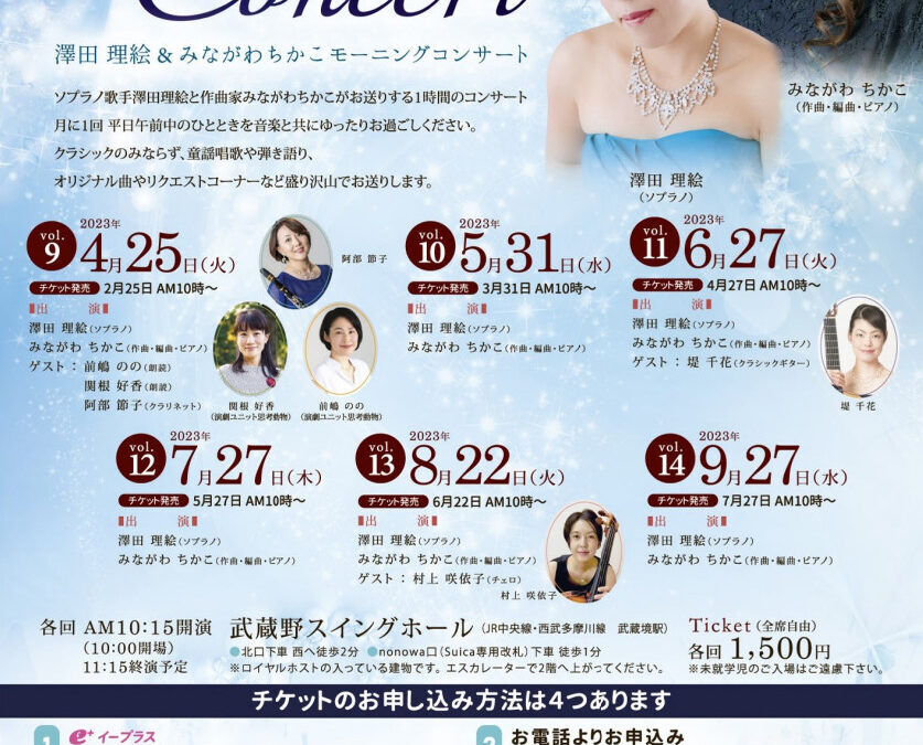 出演者: 澤田理絵(ソプラノ)、みながわちかこ(作曲・編曲・ピアノ) 、ゲスト 堤千花(クラシックギター)