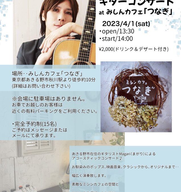 プログラム: ミシン、服飾が展示してあるおしゃれな空間でのアコースティックコンサート。映画音楽、クラシック、ポップスからオリジナルまで‥幅広く演奏致します。