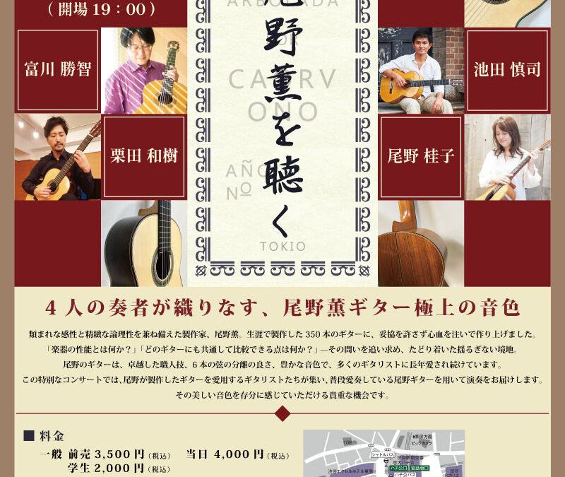 この特別なコンサートでは、尾野が製作したギターを愛用するギタリストたちが集い、普段愛奏している尾野ギターを用いて演奏をお届けします。