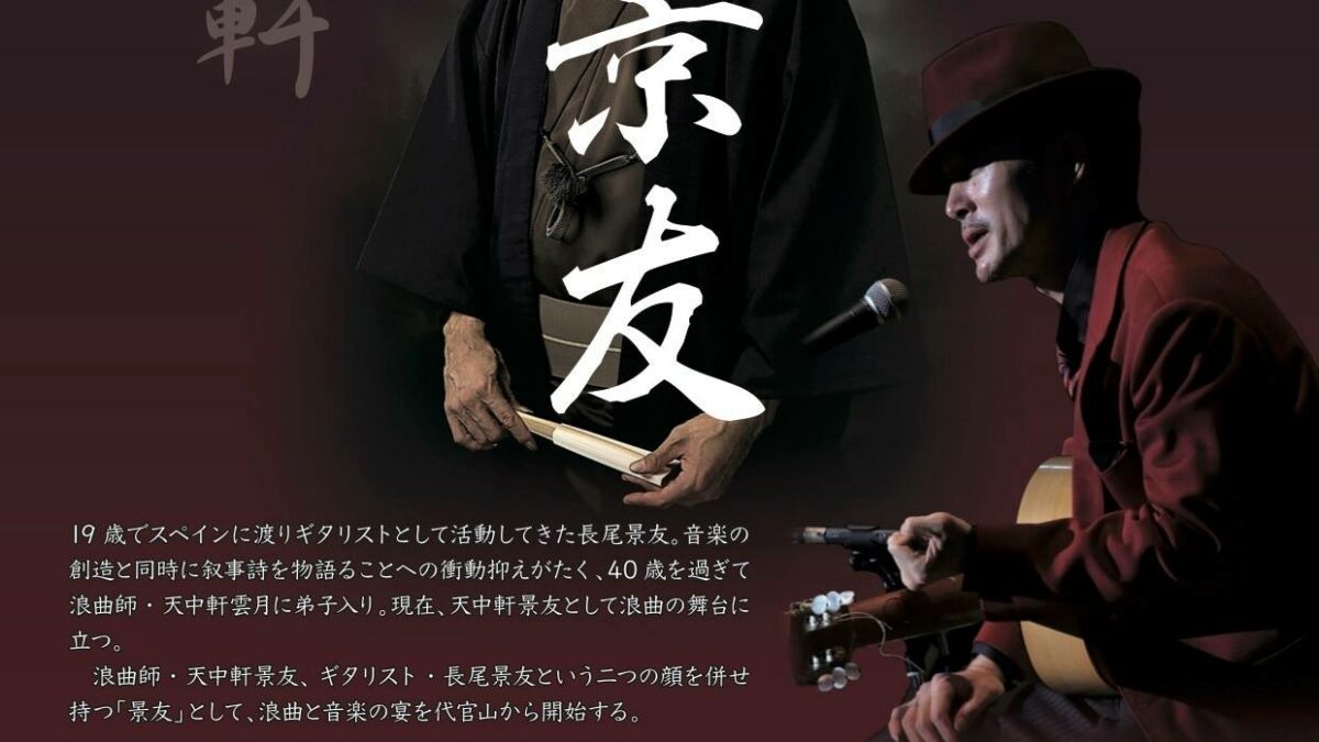 出演者: ギター・唄・語り 長尾景友、セカンドギター 渕崎昭彦、三味線 澤村美舟、 ヴァイオリン ミンケンキ、パーカッション 馬場一人