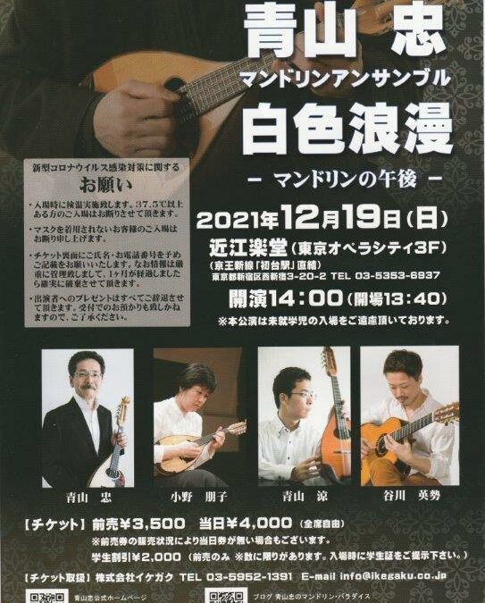 出演者: マンドリン:青山忠・小野朋子、マンドラ:青山涼、ギター:谷川英勢