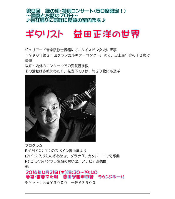 上野入谷教室でクラシックギターを担当する益田正洋講師がNPO法人 緑の街ミュージックフレンズ 主催で贈るコンサートです。