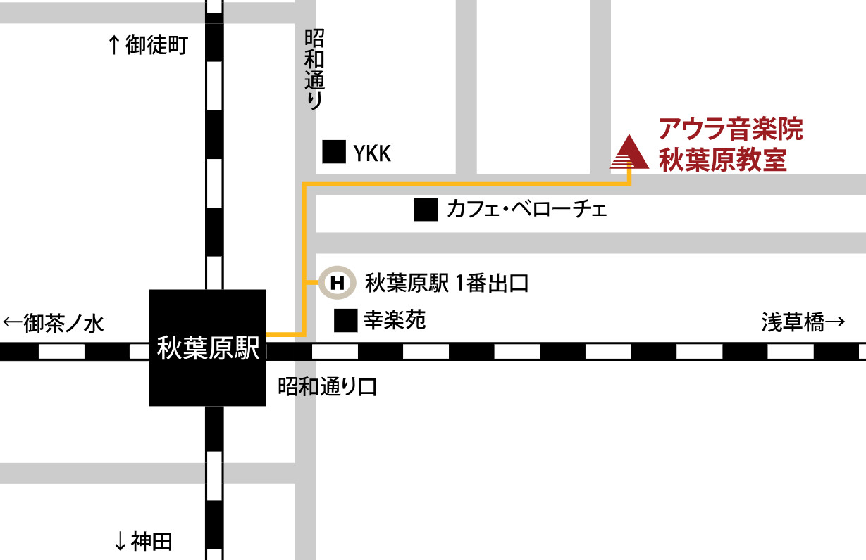 JR秋葉原駅の「昭和通り改札」を出て正面の横断歩道を渡り「幸楽苑」に突き当たったら左に曲がります。