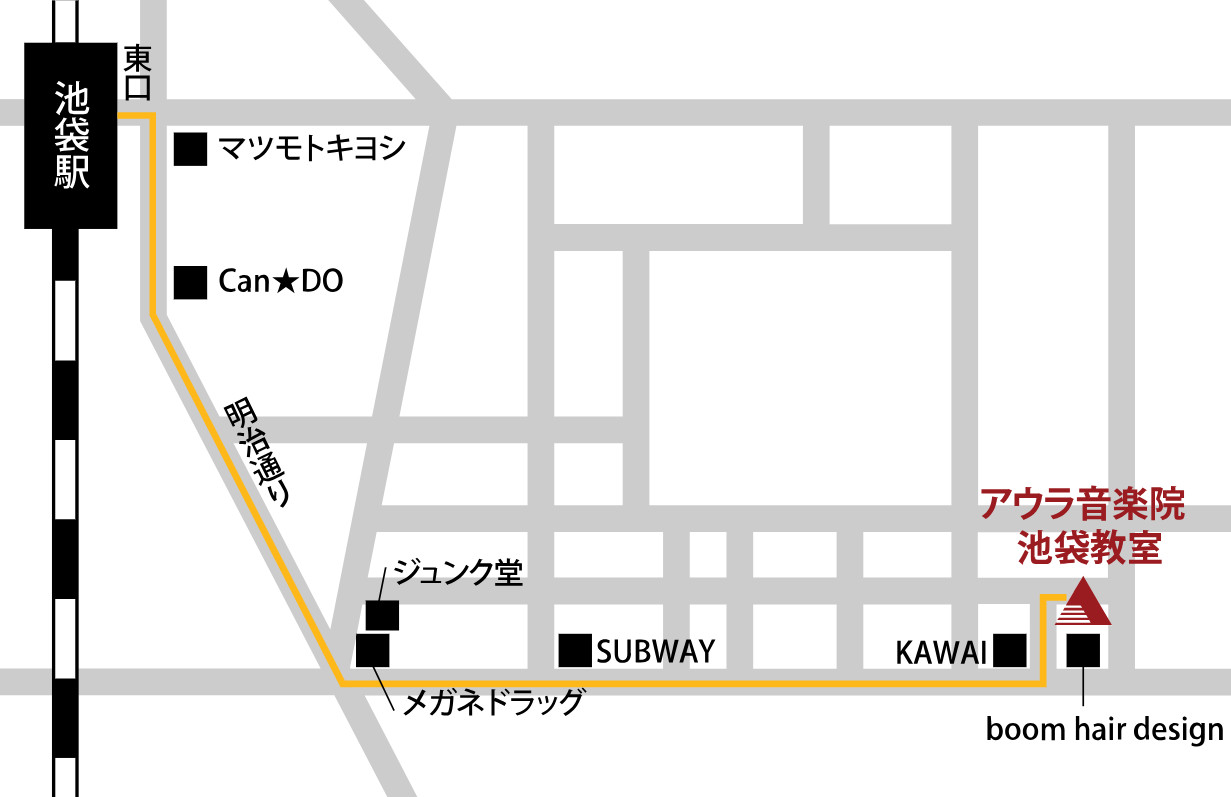 南池袋一丁目交差点で「東通り」に入り「サブウェイ」「ファミリーマート」を通り過ぎて、美容室「boom hair design」の手前で左折、右手に見える茶色いビルです。1階からお入りください。