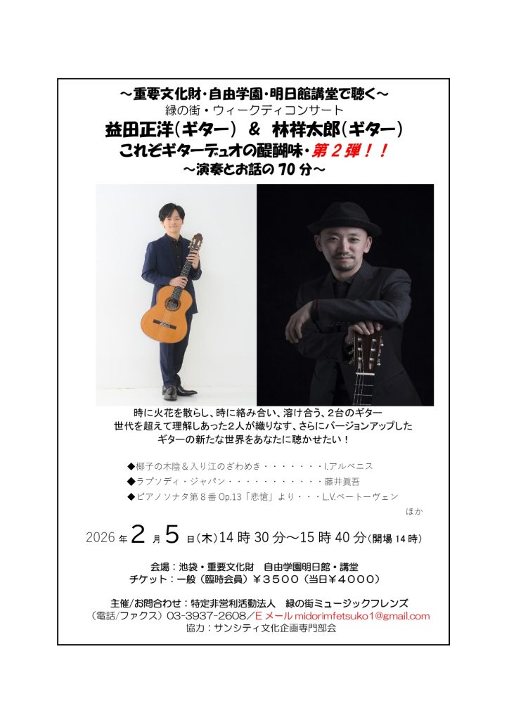 益田正洋講師(上野入谷教室担当)出演!「 重要文化財・自由学園明日館講堂で聴く ギターデュオ第2弾!!」2026年2月5日(木) 2026年02月05日(木)